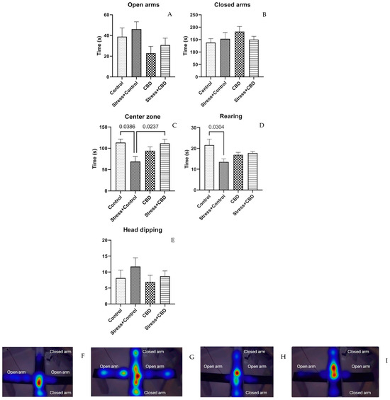 The EPM did not reveal any statistically significant difference between the groups for the time spent in opened (p = 0.0985) and closed arms (F (3, 36) = 1.097, p = 0.3643), Figure 3A,B. As for the time spent in the central zone (F (3, 36) = 3.819, p = 0.0188), the Stress + Control group spent a shorter time here compared to the Stress + CBD (Stress + CBD—111.6 ± 9.717 vs. Stress + Control—68.75 ± 11.87, p = 0.0237) and Control groups (Control—113.3 ± 8.434 vs. Stress + Control—68.75 ± 11.87, p = 0.0386), Figure 3C. The rearing duration also differed between the Stress + Control group and Control group (Control—21.63 ± 2.834 vs. Stress + Control—13.50 ± 1.488, p = 0.0304), as can be seen in Figure 3D.