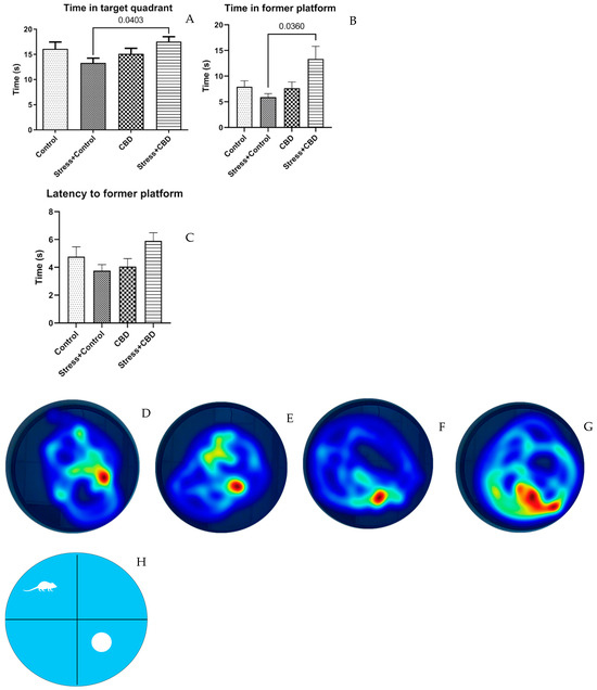 The time spent in the target quadrant (F (3, 36) = 2.384, p = 0.0881) by the Stress + CBD group is significantly longer than that of the Stress + Control group (Stress + CBD—17.52 ± 0.9843 vs. Stress + Control—13.31 ± 0.9496, p = 0.0403), Figure 4A. This correlates with the time spent in the former platform place (F (3, 36) = 3.549, p = 0.0241), (Stress + CBD—13.37 ± 2.441 vs. Stress + Control—5.906 ± 0.6776, p = 0.0360), Figure 4B. It is noteworthy that the latency to the former platform does not differ, with longer time being spent by the Stress + CBD group, F (3, 36) = 2.623, p = 0.0664, as can be seen in Figure 4C.