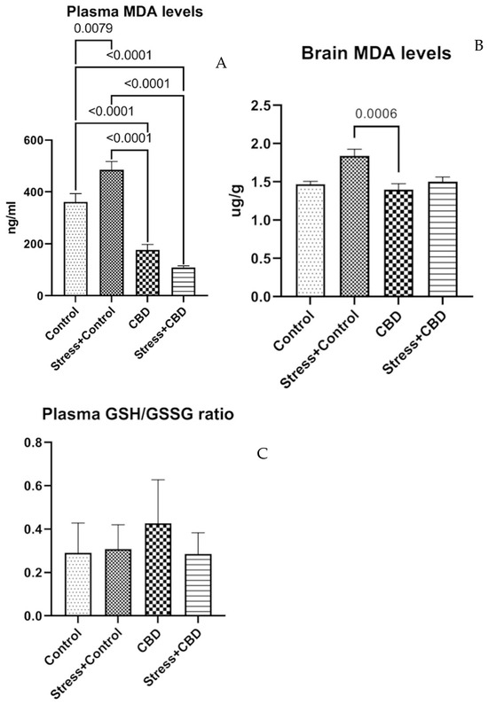 The plasma MDA level reveals the differences between the groups included in the study (F (3, 36) = 52.96, p < 0.0001). The highest level of MDA is in the Stress + Control group, while the lowest level of MDA in plasma is in the Stress + CBD group. For the brain MDA level, the tendency remains (F (3, 36) = 7.522, p < 0.0006), with the Stress + Control group having the highest values as can be seen in Figure 5A,B. The plasma GSH/GSSG ratio reveals no statistical differences, with the CBD group having the highest ratio (F (3, 35) = 2.286, p = 0.0958) as can be seen in Figure 5C.