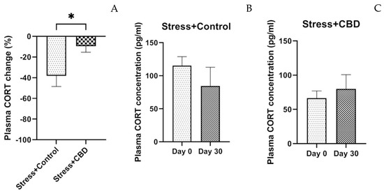 Plasma cortisol (CORT) differences expressed as percentage (A), with unpaired t test employed. Plasma CORT concentration in Stress + Control group (B). Plasma CORT concentration in Stress + CBD (C). Data are expressed as mean ± SEM. Paired t test was applied for Stress + CBD group and Wilcoxon test was applied for Stress + CBD group. * p < 0.05.