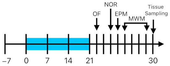 Experimental timeline. Rats were exposed to psychosocial stress between day 0 and 21. On day 10 and 20, the rats were exposed to a predator odor. CBD and vehicle were administered for 30 days. OF, open field—day 22; NOR, novel object recognition—day 24; EPM, elevated plus maze—day 25; MWM, Morris water maze—days 26–29; tissue sampling—day 30.