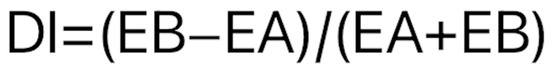 The discrimination index (DI) is the ratio between the difference between the time spent with the novel object (EB) and time spent with the familiar object (EA), and the total time spent with the objects.