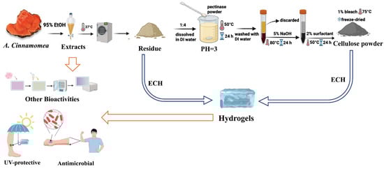 4.12. Preparation of Hydrogels Using A. cinnamomea Residue and Residue-Derived Cellulose