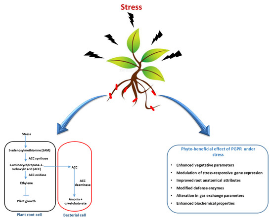 A schematic representation of the role of plant growth-promoting rhizobacteria (PGPRs) in mitigating plant stress through ACC deaminase activity, which lowers ethylene levels in stressed plants and leads to enhanced growth, improved root and biochemical attributes, the modulation of stress-responsive gene expression, and overall phyto-beneficial effects under adverse conditions.
