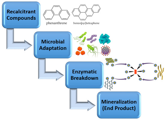Stepwise microbial degradation of recalcitrant organic compounds. Recalcitrant compounds undergo microbial degradation, followed by enzymatic breakdown, ultimately leading to their mineralization into end products.