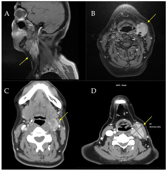 The surgical specimen, “left radical neck dissection”, showed a malignant gastrointestinal neuroectodermal tumor (4 × 2.5 cm), with involvement of the vagus nerve, adventitial layer of the internal carotid artery, and sternocleidomastoid muscle. The surgical resection margin is clear (at >1 mm). Twenty-two lymph nodes measuring between 0.6 and 0.1 cm were isolated, showing nonspecific reactive lymphadenitis, negative for tumor (0/22), as was the submandibular gland. No fusions were detected in ALK, ROS1, RET, MET, N-TRK1, N-TRK2, or N-TRK3 genes in the Ydilla Genefusion Test. The tumor was composed of epithelioid eosinophilic neoplastic cells with focal cytoplasmic clearing, organized in solid nests, often exhibiting a pseudoalveolar growth pattern (Figure 3A,B) and diffusely expressing S100. The diagnosis MGNET was confirmed. The patient received full-dose postoperative radiotherapy (50 Gy in 25 fractions) with the VMAT technique (Figure 4B,C). During the follow-up period, the patient presented distant metastases in the right gluteal and left paravertebral regions (Figure 5B,C) 3 years after the initial surgery. The patient started systemic chemotherapy with six different lines of treatment due to poor response. The patient died of massive left supraclavicular recurrence with lung involvement (Figure 5A) 54 months after her initial surgery.