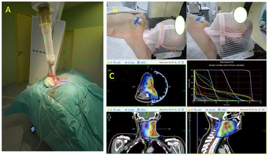 Mixed radiotherapy protocol combining intraoperative radiotherapy (IORT), administered directly to the tumor bed during surgery, followed by postoperative external beam radiotherapy (EBRT) to optimize local disease control. (A) Patient setup under general anesthesia for point-of-care photon radiotherapy. (B) Placement and fitting of a customized thermoplastic mask on the patient’s face, ensuring stable fixation to the anatomical landmarks. Facial features have been masked for privacy. (C) Radiotherapy planning and dose distribution over axial, sagittal, and coronal views, including dose–volume histogram analysis.