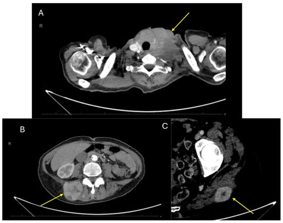 CT images of recurrences during the follow-up period: (A) Extensive supraclavicular recurrence 4 years after radical surgery. Absence of the vascular bundle of the neck, resected in radical cervical dissection surgery. (B) Contralateral paravertebral metastasis 3 years after diagnosis. (C) Ipsilateral gluteal metastasis 3 years after initial diagnosis.