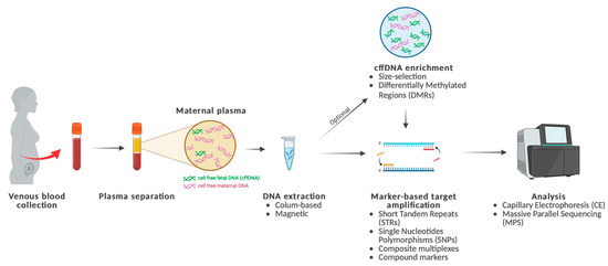 In summary, extraction methods are predominantly column-based [21] or magnetic [22,23]. Enrichment strategies exploit the differences between cffDNA and maternal DNA fragments. They can be applied to selectively increase cffDNA concentrations in plasma [24,25]. The most common are selection of DNA fragments based on their size [26], which is typically shorter for cffDNA (<300 bp) [27], or selection based on Differentially Methylated Regions (DMRs) [28]. The analysis of cffDNA for NIPPT relies on target amplification, which can be performed using different genetic markers such as Short Tandem Repeats (STRs), Single Nucleotide Polymorphisms (SNPs), compound markers, and composite multiplexes. The analysis is generally performed using Capillary Electrophoresis (CE) or Massive Parallel Sequencing (MPS).