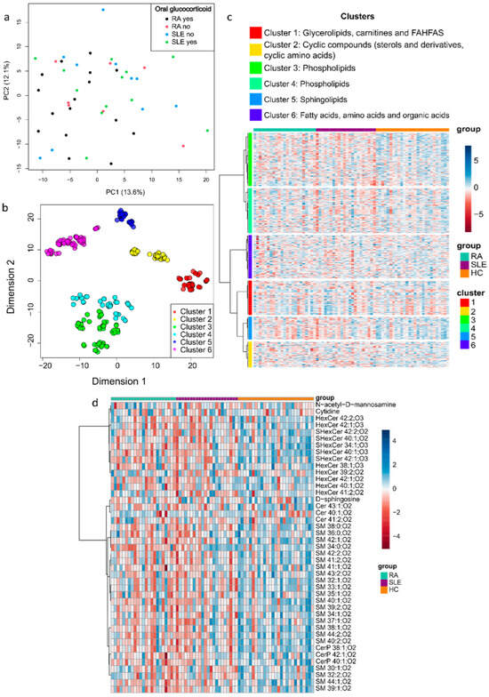 Metabolite mapping of RA patients, SLE patients, and HCs. (a) PCA was performed to assess the impact of medication on the metabolic profiles of RA and SLE patients. (b) The metabolites were classified according to their chemical similarity in six clusters. Each colored circle represents a metabolite. (c) Heatmap showing the variation of the metabolites belonging to each cluster across the study groups. (d) Heatmap showing in detail the variation of the metabolites belonging to cluster 5 (sphingolipids).