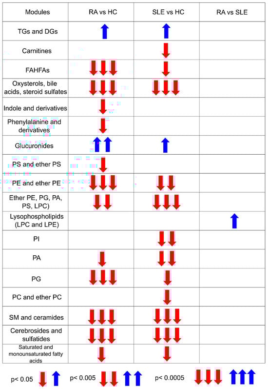 Phospholipids, key components of cell membranes, consist of a glycerol backbone ester bonded to two fatty acids and a phosphate group, which is linked to a polar group. These phospholipids are categorized into various classes, such as phosphatidylcholine (PC), phosphatidylethanolamine (PE), phosphatidylserine (PS), phosphatidylinositol (PI), phosphatidic acid (PA), and phosphatidylglycerol (PG), with PC and PE being the most abundant in mammalian cells []. Across the RA and SLE patient groups, significant variations in phospholipid levels were observed compared to HCs (Figure S4c). PE, including ether PEs, as well as PAs and PGs, were decreased in both RA and SLE, while PSs, including ether PSs, were specifically decreased in RA versus HC, and PIs were significantly reduced in SLE versus HC. Ether phospholipids, which have an alkyl or vinyl bond linking a fatty alcohol at the sn-1 position of the glycerol backbone [], were also significantly decreased in RA and SLE compared to HC. Lysophospholipids, characterized by having only one fatty acid moiety, were significantly increased in RA compared to SLE, representing the only significant difference between the two diseases. Additionally, PCs, including ether PCs, were significantly decreased in SLE compared to HCs (Figure S4d).