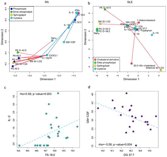 Metabolite and cytokine correlation network in (a) RA patients and (b) SLE patients. Positive and negative correlations are represented by blue and red lines, respectively. (c) Correlation between IL-2 and FA 18:0 in RA patients. (d) Correlation between GM-CSF and DG 37:7 in SLE patients.