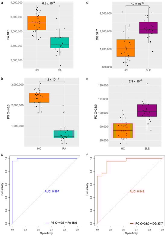 (a) Box plot of FA 18:0 levels across HC and RA. (b) Box plot of PS O-40:3 levels across HC and RA. (c) Receiver operating characteristic (ROC) curve for combined biomarker PS O-40:3 + FA 18:0. (d) Box plot of DG 37:7 levels across HC and SLE. (e) Box plot of PC O-28:0 levels across HC and SLE. (f) Receiver operating characteristic (ROC) curve for combined biomarker PC O-28:0 and DG 37:7.