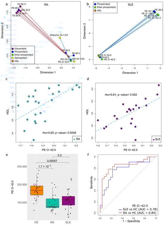 To further assess its potential clinical relevance, we performed an ROC analysis to evaluate its diagnostic performance. The results demonstrated an AUC of 0.84 for RA vs. HC, which outperformed the 0.78 observed for SLE vs. HC (Figure 5f), reinforcing the potential role of PE O-42:5 as a biomarker linked to lipid metabolism and cardiovascular risk in these diseases.