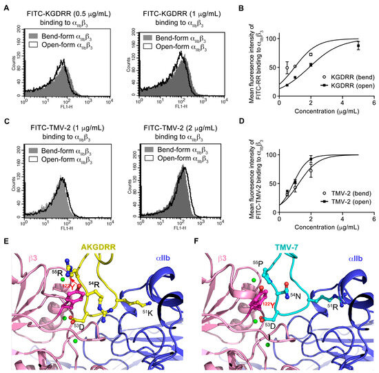 Using X-ray crystal structures of integrin αIIbβ3 in complex with a GRGDSP peptide (PDB code: 3ZE2 [11]) and CCP4i 7.1 software, we generated models of the αIIbβ3–TMV-7 and αIIbβ3–KGDRR complexes (Figure 1E,F). The KGDRR–αIIbβ3 complex revealed a central cation-π interaction between Arg55 in the RGD-containing loop of KGDRR and Tyr122 of the β3 subunit (Figure 1A, Table 2). This interaction was abolished when the RGD domain of KGDRR (50AKGDRR55) was replaced with that of (50ARGDNP55), underscoring the critical role of Arg55 in stabilizing the inactive conformation of αIIbβ3.