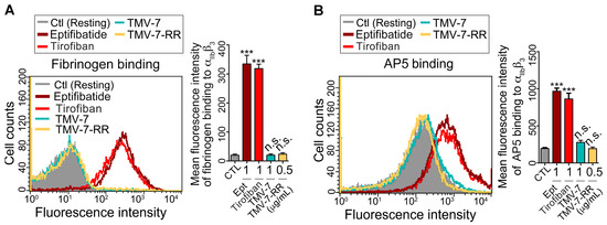 Priming assay was performed as described previously, with minor modifications [15,26]. Washed platelets in HEPES-modified Tyrode’s buffer were treated with the eptifibatide, TMV-2, TMV-7, or KGDRR for 30 min at RT, and then the platelets were fixed with 1% paraformaldehyde. After quenching the paraformaldehyde with glycine and washing, fluorescent fibrinogen (200 μg/mL) was added for 30 min at 37 °C, and then bound fluorescent fibrinogen was detected by flow cytometry.