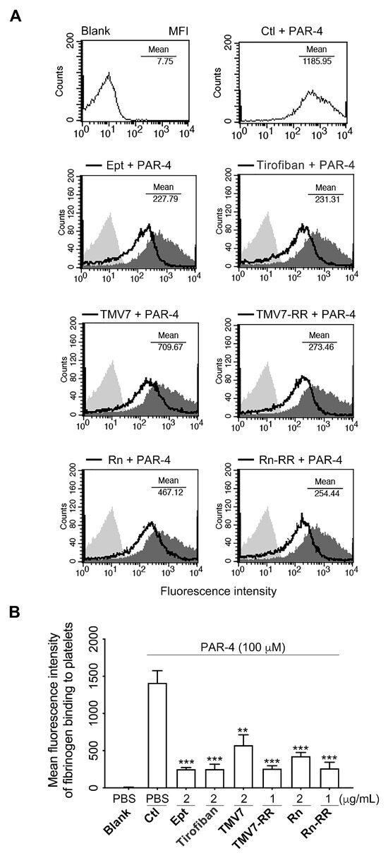 Effect of KGDRR on PAR-4-induced fibrinogen binding to the integrin αIIbβ3. (A) Flow cytometric analysis of 100 μM PAR-4-induced fibrinogen binding to platelets pretreated with PBS, eptifibatide (Ept, 2 μg/mL), Tirofiban (2 μg/mL), TMV-7 (2 μg/mL), or TMV-7 based KGDRR mutant (TMV-7-RR, 1 μg/mL), Rhodostomin (Rn, 2 μg/mL), or Rhodostomin based KGDRR mutant (Rn-RR, 1 μg/mL) as indicated for 30 min. Resting platelets were used as a negative control. The histogram was representative of three similar experiments. (B) Data presented as mean ± SEM; Non-significance (n.s.), ** p < 0.01, and *** p < 0.001 as compared with PAR-4-activated group by Dunnett’s test).