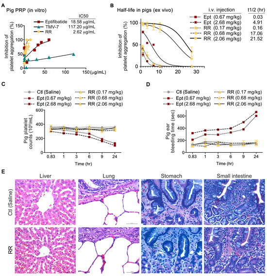 Effect of KGDRR on ex vivo platelet aggregation and in vivo hemostatic function in swine models. (A) In vitro platelet aggregation assay in pig PRP treated with saline (control) or increasing concentrations of eptifibatide, TMV-7, or KGDRR in response to 10 μg/mL collagen. The IC50 values for platelet aggregation inhibition are shown. (B) Functional half-life calculations of intravenous treatments in inhibiting ex vivo platelet aggregation in pig PRP. Pigs received intravenous injections of eptifibatide and KGDRR at increasing doses. Blood samples were collected at specified time intervals (0.83, 1, 3, 6, 9, and 24 h) post-injection. PRP was obtained via centrifugation, followed by collagen (10 μg/mL) stimulation to assess platelet aggregation. (C) Time-dependent effects of KGDRR and eptifibatide on thrombocytopenia in pigs. Whole blood samples were collected from pigs at 0.83, 1, 3, 6, 9, and 24 h post-intravenous injection, and platelet counts were measured at each time point to evaluate the impact of the treatments on thrombocytopenia. (D) Bleeding time measurement in pigs at 0.83, 6, 9, and 24 h post-administration of the agents. At each time point, the mean values of independent measurements were recorded as the bleeding time. (E) Representative histological sections of pig liver, lung, stomach, and small intestine specimens stained with hematoxylin and eosin (H&E) to assess potential tissue damage or bleeding complications (Scale bars, 50 μm). (n ≥ 3 per group; data are presented as mean ± SEM).