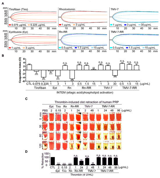 To further assess the safety profile of pure antagonists, we performed a thrombin-induced clot retraction assay. Consistent with the ROTEM assay findings, thrombin-induced clot retraction in human PRP was significantly impaired by Eptifibatide (2 μg/mL) and Tirofiban (0.15 μg/mL), but remained unaffected by Rn-RR (1 μg/mL), TMV-7 (2 μg/mL), or KGDRR (1 μg/mL) (Figure 7C,D).