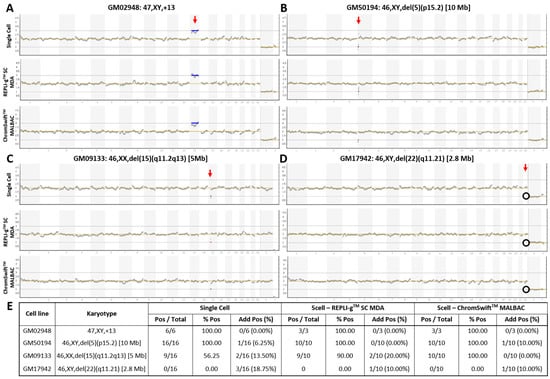 Copy number variation plots of karyotype-known cell lines with whole-chromosome and segmental imbalances. Samples of (A) trisomy 13, and cell lines with (B) 10 Mb, (C) 5 Mb, and (D) 2.8 Mb microdeletions underwent Ion ReproSeqTM PGS using starting template of either a single cell, 250 pg of whole genome amplified product from five cells using the REPLI-gTM SC MDA kit, or 250 pg of whole genome amplified product from five cells using the ChromSwiftTM MALBAC kit. Red vertical arrow indicates affected chromosome. Blue horizontal line indicates duplication and red horizontal line indicates deletion. Black circle indicates absence of expected deletion. (E) Table showing aneuploidy and segmental imbalance detection accuracy by Ion ReproSeqTM PGS using single cells, REPLI-gTM SC MDA and ChromSwiftTM MALBAC WGA products as starting materials. Pos—Positive, aberration(s) present; % Pos—Percentage of positive calls/detection accuracy, frequency of detection of expected aberration(s); Add Pos (%)—Samples with additional aberrations detected and its percentage.