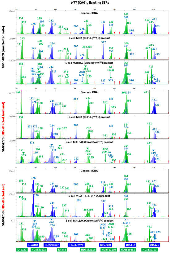 Multiplex-PCR electropherograms of microsatellites flanking the HTT CAG repeat in a Huntington’s disease (HD) case–parent trio (unaffected wife, affected husband and affected son). Multiplex PCR was performed on genomic DNA (10 ng), WGA product (2 μL) from REPLI-gTM SC MDA of five cells, and WGA product (2 μL) from ChromSwiftTM MALBAC of five cells. AF—amplification failure; ADO—allele dropout; arrowheads—incorrect or spurious alleles.