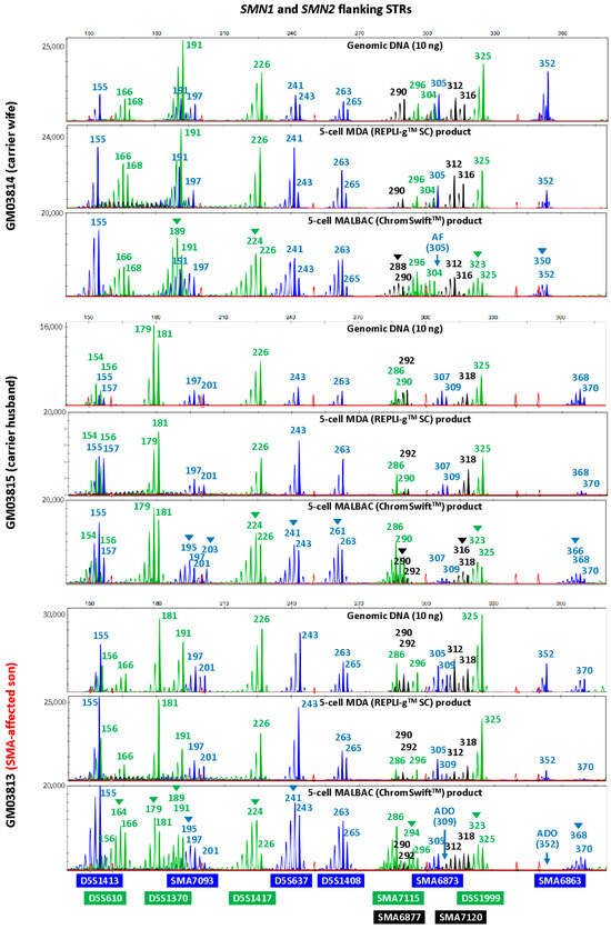 To evaluate the suitability of isothermal MDA and PCR-based MALBAC WGA for microsatellite analysis in linkage-based PGT-M, three replicates of REPLI-gTM SC MDA and ChromSwiftTM MALBAC WGA products from ten cell lines were subjected to both HD and SMA microsatellite panel PCR. Both HD and SMA microsatellite panel PCR were performed on genomic DNA (10 ng), 2 μL of REPLI-gTM SC MDA WGA product and 2 μL of ChromSwiftTM MALBAC WGA product. The WGA products were assessed for genotyping ability with reference to genomic DNA results of the respective cell lines. Representative electropherograms of the HD case–parent trios are shown in Figure 2. Microsatellite panel PCR from REPLI-gTM SC MDA WGA product generated electropherograms that closely mimic the results generated from genomic DNA. Generally, genotyping electropherograms derived from genomic DNA and REPLI-gTM SC MDA WGA products were easier and more similar. The tallest peak of each cluster is called as the genotype, and heterozygous alleles were called if there were two distinct clusters present for the marker examined, or when the two alleles have similarly tall peaks observed. On the other hand, electropherograms derived from ChromSwiftTM MALBAC WGA products have severe stutter peak patterns and spurious alleles (arrowheads), AF and ADO of individual markers, leading to erroneous genotype calls. Similar results were observed for the SMA case–parent trios as well (Figure 3). Due to the different peak patterns, genotyping of ChromSwiftTM MALBAC WGA product does not follow the same rules that were used when genotyping electropherograms derived from genomic DNA and REPLI-gTM SC MDA WGA products. Instead of looking for the tallest peak of each cluster, the last tall peak of each cluster was called as the genotype, with reference to the expected microsatellite allele sizes obtained from genomic DNA.