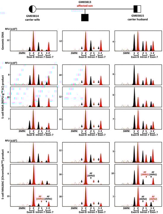 Triplex-PCR and SNaPshotTM minisequencing of exon 7, intron 7 and exon 8 of SMN1 and SMN2 in a spinal muscular atrophy case–parent trio (carrier wife, carrier husband and affected son). Assay was performed on genomic DNA (10 ng), MDA (REPLI-gTM SC) product (2 μL) from five-cell samples, and MALBAC (ChromSwiftTM) product (2 μL) from five-cell samples. SMN1 amplicons were absent in all MDA- and MALBAC-amplified five-cell samples of the affected son (arrows), consistent with his homozygous SMN1 deletion. AF—amplification failure (arrowheads). Red and black arrows indicate absence of T and C nucleotide peaks, respectively, due to SMN1 gene deletion. Red and black arrowheads indicate absence of expected T and C nucleotide peaks, respectively, resulting from SMN1 or SMN2 amplification failure.