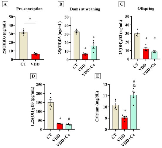 Vit. D−related metabolites in serum of Vit. D−sufficient (CT), Vit. D−deficient (VDD), and Vit. D−deficient supplemented with calcium (VDD + Ca) dams and their offspring. (A) Serum 25OHD3 (calcidiol) concentrations in CT and VDD dams in pre−conceptional period (n = 5). (B) Serum 25OHD3 (calcidiol) concentrations in CT, VDD, and VDD + Ca dams at weaning (PN21) (n = 4). (C) Serum 25OHD3 (calcidiol) concentration. (D) Serum 1,25(OH)2D3 (calcitriol) concentration and (E) serum calcium concentration in the male offspring at weaning (PN21) (n = 5). The data are expressed as mean ± SEM. Unpaired two−tailed Student’s t−tests or One−way ANOVA followed by Tukey’s post hoc test. * p < 0.05 VDD versus CT group. # p < 0.05 VDD + Ca versus CT group, and & p < 0.05 VDD + Ca versus VDD group.
