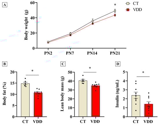 Once perinatal VDD was validated, we investigated its outcomes in body composition and metabolic parameters in the offspring. The data showed that VDD male offspring had an impairment in postnatal growth, as demonstrated by reduced body weight at weaning (Figure 2A). Moreover, a lower body fat percentage and absolute lean body mass were observed in the VDD group (Figure 2B,C). Interestingly, these effects were associated with reduced serum insulin concentrations (Figure 2D), without affecting glycemia (118 ± 6 versus 125 ± 4 mg/dL in the CT group; n = 5). Therefore, perinatal VDD negatively affects the offspring’s growth and fat accumulation during postnatal life.