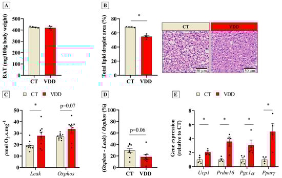 Morphological analysis, high−resolution respirometry assay, and qPCR from BAT of Vit. D−sufficient (CT) and Vit. D−deficient (VDD) male offspring at weaning (PN21). (A) Brown adipose tissue (BAT) relative weight (n = 4), (B) total lipid droplet area in BAT sections stained with hematoxylin−eosin (HE) (n = 4), (C) ex vivo oxygen consumption rate in BAT on leak and Oxphos respiratory states (CT n = 9; VDD n = 8), (D) coupling efficiency (CT n = 9; VDD n = 8), and (E) relative gene expression of thermogenic genes (n = 4) in BAT. The data are expressed as mean ± SEM. Unpaired two−tailed Student’s t−tests. * p < 0.05 versus CT group.