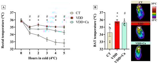 Cold tolerance test in Vit. D−sufficient (CT), Vit. D−deficient (VDD), and Vit. D−deficient supplemented with calcium (VDD + Ca) male offspring at weaning (PN21). (A) Rectal temperature during 5 h of cold exposure (4 °C) (n = 5) and (B) brown adipose tissue (BAT) temperature estimated through infrared thermography (n = 5). The pictures were taken in the last hour of cold. The data are expressed as mean ± SEM. One−way ANOVA followed by Tukey’s post hoc test. * p < 0.05 VDD versus CT group. # p < 0.05 VDD + Ca versus CT group.