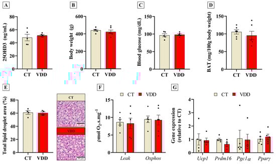 Effects of perinatal Vit. D deficiency in the adult (180 days-old) male offspring receiving a Vit. D−sufficient diet (Nuvital) after weaning. (A) Serum 25OHD3 (calcidiol) concentration (n = 5), (B) body weight (n = 6), (C) blood glucose (n = 5), (D) brown adipose tissue (BAT) relative mass (n = 6), (E) total lipid droplet area in BAT sections stained with HE (n = 4), (F) ex vivo oxygen consumption rate in BAT on leak and Oxphos respiratory states (n = 6), and (G) relative gene expression of thermogenic genes in BAT (n = 6) from the adult offspring (180−days old) born and breastfed in Vit. D−sufficient (CT) or Vit. D−deficient (VDD) mothers. The data are expressed as mean ± SEM. Unpaired two−tailed Student’s t−tests.