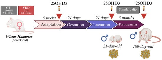 General experimental design of the study. Forty female Wistar Hannover rats were fed either a vitamin D-sufficient diet (Control group, CT; n = 20) or a vitamin D-deficient diet (VDD group; n = 20) for a 6-week adaptation period, continuing through gestation and lactation. Male offspring were evaluated either at weaning or after being maintained on a standard diet until adulthood (180 days of age). Serum 25OHD3 levels were measured at multiple time points in both dams and their offspring (indicated by red arrows). Brown adipose tissue (BAT) was collected at weaning and in 180−day−old male offspring for histological, respirometric, and gene expression analyses. This figure was developed by the authors in “Biorender”. https://app.biorender.com/ (accessed on 18 April 2025).
