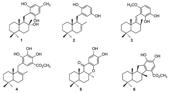 Molecular chemical structures of natural bioactive merosesquiterpenoids 1–6.