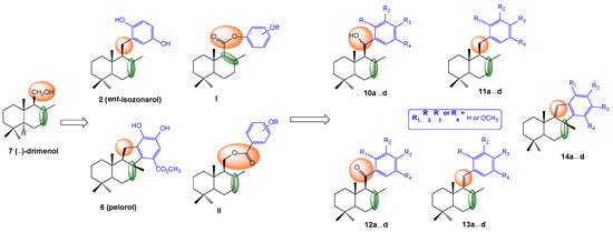 The procedure used by Alvarez-Manzaneda et al. [45] was followed with some modifications. A 1.7 M solution of tert-butyllithium in pentane (2.4 mL) at −80 °C was dripped into a solution of the correspondent bromo benzene derivative 9a–d (3.68 mmol) in THF (25 mL) under an argon atmosphere. After stirring for 1.5 h at this temperature, drimenal (0.4 g, 1.82 mmol) was added, and the mixture was further stirred for 1.5 h at −80 °C. Water (12 mL) was added, the mixture was diluted with ether (80 mL), and the organic phase was washed with brine, dried, and concentrated to obtain a crude, which was taken to silica gel chromatography to afford the product.
