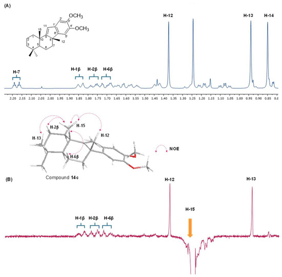 The unambiguous structural identification of compound 14c was conclusively established through the application of 1H and 13C NMR spectroscopic techniques, as demonstrated in the Supplementary Material. Additionally, these signals were correlated with 2D HSQC and 2D HMBC, and the spatial orientation of CH3-12 was determined using a selective 1D NOESY experiment, where the signal of CH3-15 (δH = 1.24 ppm) showed spatial correlations with CH3-13 and CH3-12, indicating that these H atoms have the same spatial β-orientation (Figure 3).