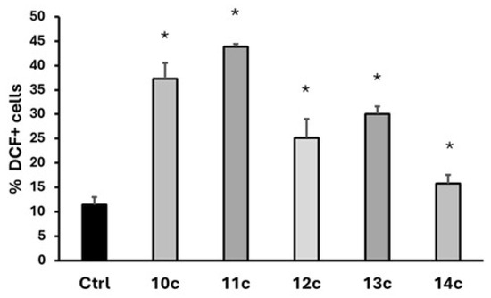 An increase in intracellular ROS may be one of the factors that contribute to the cytotoxicity of certain compounds in cancer cell lines [35,36,37,38,39]. In fact, ROS and mitochondrial damage are often associated with the induction of cell death. Therefore, ROS levels were evaluated by flow cytometry after 24 h of treatment with compounds having the 3,4-dimethoxy pattern in the aromatic ring (10c, 11c, 12c, 13c, and 14c), at their respective IC50 values, using the fluorescent probe dichlorofluorescein diacetate (DCFH2-DA). DCF fluorescence was then measured by flow cytometry. The difference in the percentage of DCF-positive cells between treated and control cells was used to indicate an increase in intracellular ROS, as shown in Figure 4. For all of these compounds, treatment significantly increased the fluorescence in MCF-7 cells compared to the control, indicating an increase in intracellular ROS levels in the MCF-7 cell line (Figure 4). Compound 11c was the most effective in this assay.