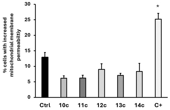 The effect of the compound’s treatment on mitochondrial membrane potential. Cells were treated with 10c, 11c, 12c, 13c, and 14c (respective IC50 values for each compound for 24 h), and mitochondrial membrane permeability was determined in the human breast cancer cell line MCF-7 by flow cytometry using rhodamine 123. * p < 0.05 versus control cells (Ctrl). The data represent the means ± S.D. of at least three experiments with triplicate samples.
