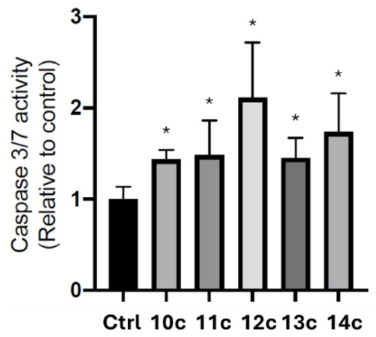 Since ROS levels were increased in the MCF-7 cancer cell line in response to the compounds, it is important to determine whether this effect is associated with the onset of apoptotic cell death. To identify the type of cell death triggered by the most effective sesquiterpene derivatives (10c, 11c, 12c, 13c, and 14c), we assessed their aptitude for activating caspases 3/7 on MCF-7 cells, thereby inducing apoptosis. Cells were treated with the selected compounds at 50 μM for 24 h, incubated in situ with the Caspase-Glo 3/7 marker assay, and then analyzed in a luminometer. As shown in Figure 6, exposure to the compounds considerably enhanced caspases-3/7 activity in the MCF-7 cell line. These results suggest the activation of the apoptotic pathway.