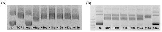 The effect of sesquiterpene aryl esters on TOP1- and TOP2-induced DNA relaxation was assessed. (A) The TOP1 inhibition assay evaluated the compounds (10c, 11c, 12c, 13c, and 14c) at a concentration of 20 μM in a DNA relaxation assay. (B) The TOP2 inhibition assay examined the same compounds at the same concentration in a DNA relaxation assay. The solvent used to dilute the compounds in the study and the absence of TOP1 or 2 are referred to as Sol. The presence of TOP1 or 2 indicates the assay conditions in the absence of compounds. C—the negative control without TOP1 or 2. Dau = daunorubicin as positive control of TOP1/2 inhibition.