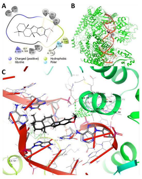 The 3D representation (Figure 8B,C) shows that molecule 14c is inserted between the nitrogen bases of the DNA, disrupting the DNA–topoisomerase interaction. The benzo-cyclopentadiene core of 14c is positioned between the bases, while hydrophobic contacts with the protein are established by methoxy groups and the drimane moiety (Figure 8C). The benzene ring is found to be 3.92 Å away from the DC8 base, interacting through potential π-stacking. Additionally, an oxygen atom of methoxy is situated 3.16 Å away from the NH2 group of the DA6 base, potentially forming a hydrogen bond or dipole–dipole interaction. Multiple hydrophobic contacts with Gly779, Gln778, and Ala779 are formed by the methoxy groups. Furthermore, multiple hydrophobic contacts with the side chain of Arg503 are formed by the axial methyl groups of the drimane system.