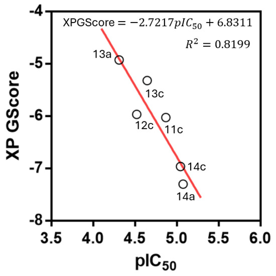 To obtain comparative information with 14c, the docking of compound 13c in the DNA-TOP2 complex was performed. Compound 13c showed the best IC50 value in MCF-7 cells (22.5 µM) within the family of non-tetracyclic molecules. However, 13c showed no inhibition of the TOP2-complex inhibition according to Figure 7B. Compound 13c showed an XP GScore of −5.321 kcal/mol, compared to −6.964 kcal/mol for 14c. This difference could be attributed to the fact that 13c failed to properly intercalate between the nitrogenous bases of DNA, as shown in Figures S1 and S2, which show several unfavorable steric contacts between the compound and the enzyme complex. Additionally, the docking study of 14c in the DNA-TOP1 complex was performed (PDB ID: 1K4T) to explain why 14c did not show significant inhibition of the DNA-TOP1 complex compared to TOP2. In Figures S3 and S4 show the best docking pose for 14c with TOP1, where this molecule is oriented parallel to the DNA double strand and fails to intercalate between the nitrogenous bases. In Figure 9, we present the correlation between the pIC50 values and the XP GScore. Linear regression was observed for the most active compounds of the series: 11c, 12c, 13a, 13c, 14a, and 14c. Only compound 10c did not fit the correlation.