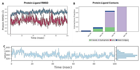 The molecular dynamics (100 ns) results for the topoisomerase–DNA complex and 14c. (A) The RMSD plot. The protein RMSD is shown in blue, and the complex ligand RMSD is shown in red. (B) The protein–ligand contacts’ plot. (C) The Solvent Accessible Surface Area (SASA) plot.