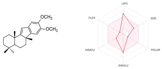 One key aspect to consider in the search for antitumor drugs is their pharmacokinetic properties. Not only are cytotoxic properties, the mechanism of action, and cell death important, but physicochemical properties that influence drug absorption, distribution, metabolism, and excretion (ADME) must also be considered. By doing so, these properties can be taken into account during the optimization of a bioactive compound, ultimately making it a suitable candidate for preclinical studies [42]. To assess the physicochemical properties of compound 14c, the free online platform SwissADME (http://www.swissadme.ch/index.php, accessed on 15 March 2025) was utilized in accordance with the Lipinski and Veber rules. According to these criteria, compound 14c exhibited promising permeability and bioavailability due to its HBD, HBA, and MW values. However, its cLogP value was found to be close to the optimum limit [43]. Additionally, 14c has a topological polar surface area (TPSA) and a number of rotatable bonds (NRB) value that are both less than 140 Å2 and ≤10 NRB, respectively (Table 2), and these values meet the criteria set forth by Veber’s rules [44]. Based on the results provided by both models, it can be concluded that 14c has a high potential for penetrating cell membranes and demonstrates good oral absorption. Furthermore, the bioavailability radar plot generated by the SwissADME platform suggests that 14c is likely to exhibit good oral absorption (Figure 11). Predicted ADME and toxicity parameters are summarized in Table 2. Compound 14c fits well within Lipinski’s rule of five for good oral bioavailability, with a low number of hydrogen bond acceptors (HBAs) and hydrogen bond donors (HBDs), a topological polar surface area (TPSA) below 140 Å2, and fewer than 10 rotatable bonds (NRB). The only exception is the cLogP value, which is slightly above 5.0.