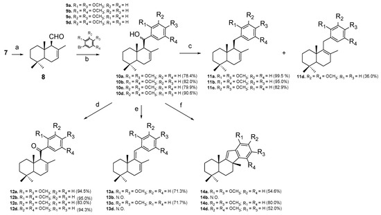 New dimethoxyaryl-sesquiterpene derivatives 10a–d, 11a–d, 12a–d, 13a and 13c, and 14a, c–d were obtained by the short and efficient synthetic route shown in Scheme 1. (-)-drimenol (7) was the initial material and was sourced from the hexane extract of the bark of Drimys winteri Forst [23]. Subsequently, 7 was treated with pyridinium chlorochromate (PCC) in dichloromethane at 0 °C to obtain a good yield of drimenal 8 (78%) [24]. Nucleophilic addition of organolithium derivatives 9a–d to aldehyde 8, according to known procedures [25,26,27,28], gives the corresponding secondary alcohols 10a–d in very good yields (78.4–90.6%).