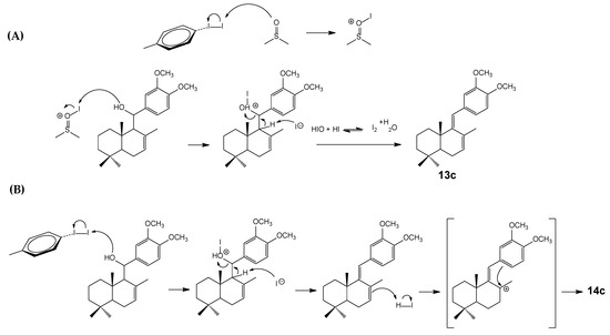In a second part, the oxidation products of 12a–d were obtained by the oxidation of 10a–d with pyridinium chlorochromate (PCC) in dichloromethane in an efficient step (83–95% yields). Thirdly, dienes 13a and 13c and cyclized compounds 14a, c–d (Scheme 1) were prepared using a similar methodology described by Domingo et al. [30,31] (Scheme 2). Dienes 13a and 13c (71.3–71.7%) were obtained using iodine and dimethylsulfoxide (DMSO) in reflux using the mechanism shown in Scheme 3A [30]. On the other hand, the use of iodine and toluene in reflux favors an acidic medium in which the cyclized products 14a, 14c, and 14d are obtained in good yields (52–80%) using the mechanism proposed in Scheme 3B [32].