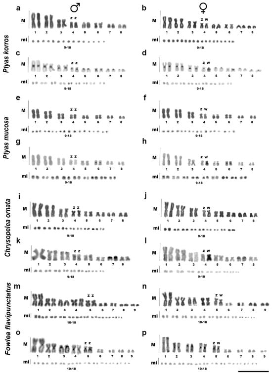 Karyotypes of Ptyas korros (a–d), Ptyas mucosa (e–h), Chrysopelea ornata (i–l), and Fowlea flavipunctatus (m–p) arranged after Giemsa staining (a,b,e,f,i,j,m,n) and C-banding (c,d,g,h,k,l,o,p). Scale bar = 10 µm.