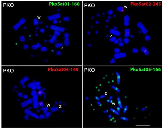 Although all six PkoSatDNAs were successfully amplified by PCR (Figure S2), only four of them (PkoSat01-168, PkoSat02-245, PkoSat04-149, and PkoSat05-166) displayed positive hybridization signals on the chromosomes of P. korros (Figure 2). PkoSat01-168 and PkoSat04-149 were found on autosomes, with PkoSat01-168 hybridizing on two pairs of microchromosomes and PkoSat04-149 on one pair of macrochromosomes (Figure 2). PkoSat02-245 was present in the subtelomeric region of the W chromosome and the centromere of the third longest pair of autosomes (Figure 2). PkoSat05-166 was mapped in the centromeric regions of almost all chromosomes, except for the W, which also showed signals mainly in the telomeric region of the long arms (Figure 2). No signal was detected on chromosome Z.