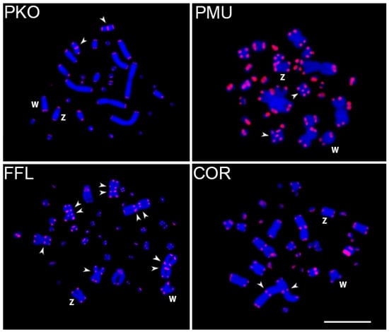 Female metaphase plates of Ptyas korros (PKO), Ptyas mucosa (PMU), Fowlea flavipunctatus (FFL), and Chrysopelea ornata (COR) hybridized with a telomeric (TTAGGG)n probe. The arrowheads indicate the interstitial telomeric sequences (ITSs). Scale bar = 10 µm.