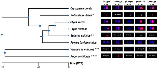 Truncated phylogenetic tree highlighting hybridization patterns of microsatellite repeats. The images referring to the W chromosome of Notechis scutattus and (*) Pogona vitticeps (****) were taken from the study published by [] while the W chromosomes of Spilotes pullatus (**) and Varanus acanthurus (***) were taken from the studies of [] and [], respectively.